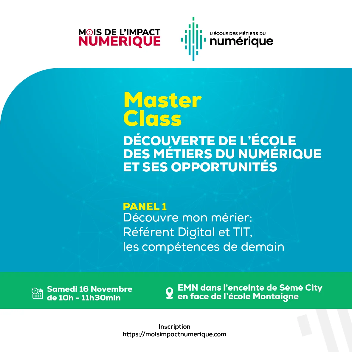 L’affiche annonce une « Master Class » organisée par « L’École des Métiers du Numérique » dans le cadre du « Mois de l’Impact Numérique ». L’événement a pour thème la « Découverte de l’École des Métiers du Numérique et ses opportunités ». Cette master class comprend un « Panel 1 » intitulé « Découvre mon métier: Référent Digital et TIT, les compétences de demain ». L’événement aura lieu le samedi 16 novembre, de 10h à 11h30, à l’EMN, dans l’enceinte de Sèmè City, en face de l’école Montaigne. L’inscription se fait via le site web : https://moisimpactnumerique.com.